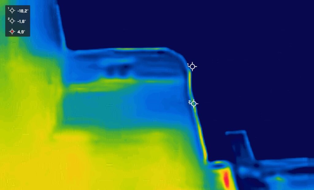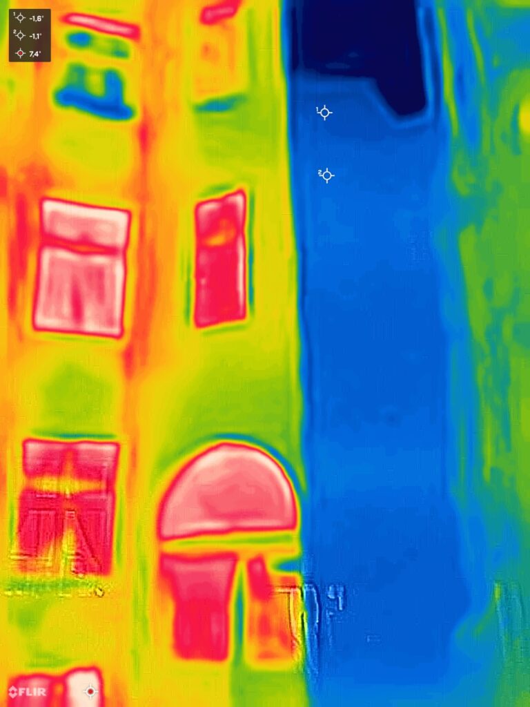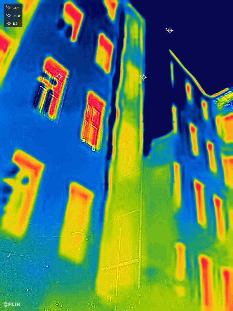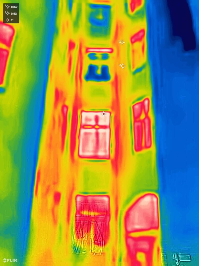 Trotzdem ließen sich während der Tour einige spannende Phänomene gut erkennen. Moderne Fenster, meist doppelt verglast, zeigten sich als dunkle Flächen, während ältere oder undichte Fenster deutlich heller abstrahlten.